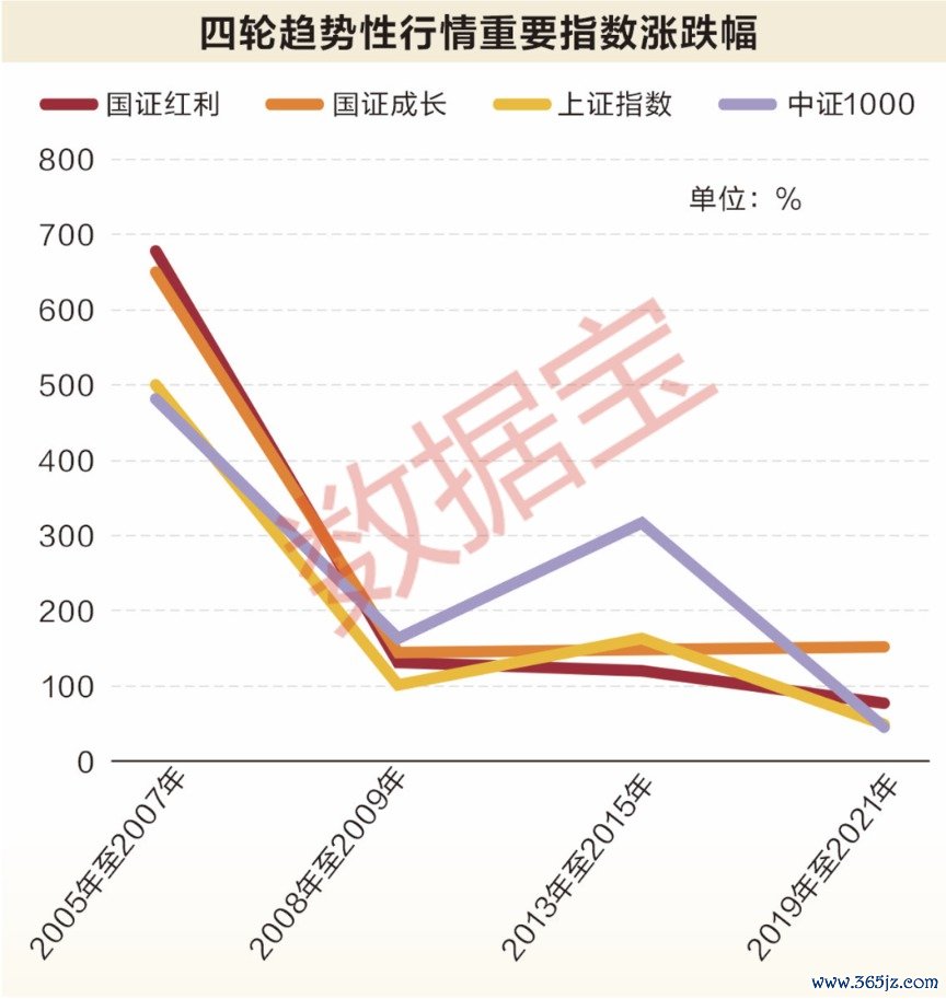 統(tǒng)計(jì)發(fā)現(xiàn),2003年以來(lái)四輪趨勢(shì)性行情中,代表價(jià)值紅利資產(chǎn)的國(guó)證紅利指數(shù)在2005年的趨勢(shì)性行情中跑贏了代表成長(zhǎng)股的國(guó)證成長(zhǎng)指數(shù),跑贏近19個(gè)百分點(diǎn);其余三輪趨勢(shì)性行情中均跑輸。