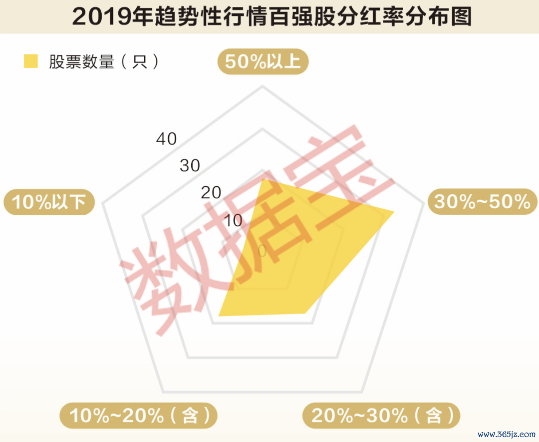 股息率高是紅利資產(chǎn)的一個(gè)特征,分紅率較高的個(gè)股同樣具有強(qiáng)烈的紅利屬性,這類(lèi)股票在趨勢(shì)性行情中的表現(xiàn)也非常亮眼。其中,2005年趨勢(shì)性行情領(lǐng)漲的百?gòu)?qiáng)股有多達(dá)48只個(gè)股,此前一年的分紅率超過(guò)30%;2008年、2013年的百?gòu)?qiáng)股則分別有25只、43只,此前一年分紅率超30%,2019年甚至有超過(guò)一半百?gòu)?qiáng)股2018年分紅率超30%。