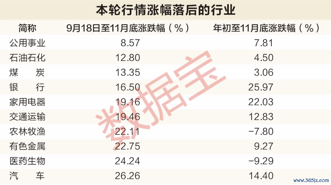 事實(shí)上,本輪行情紅利資產(chǎn)的滯漲,更多是因?yàn)榇饲氨憩F(xiàn)抗跌。從今年前11個(gè)月累計(jì)漲幅來(lái)看,銀行、家用電器等行業(yè)指數(shù)漲幅均超20%位居漲幅榜前四,交通運(yùn)輸行業(yè)指數(shù)漲幅超10%。